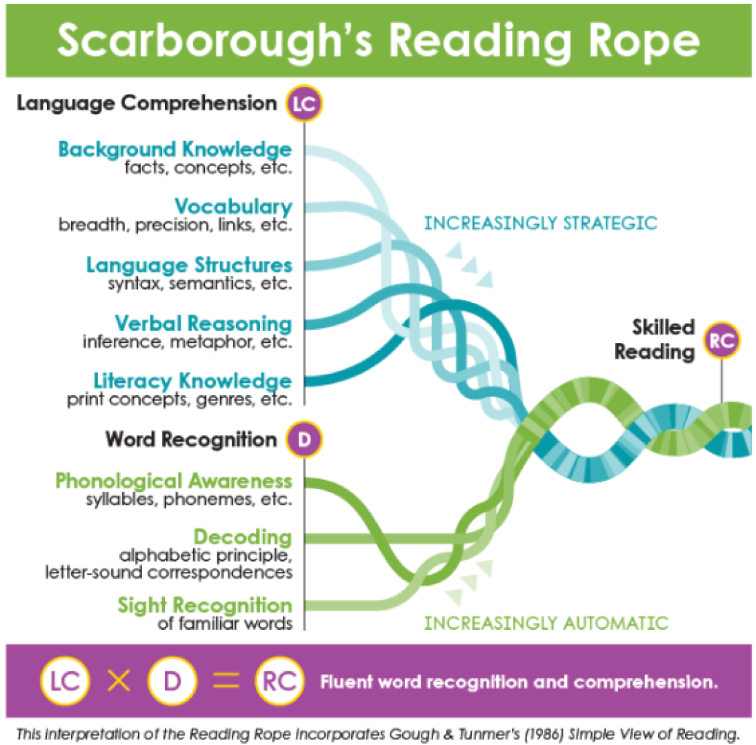 - Scarborough’s Reading Rope: Illustrates how word recognition (phonological awareness, decoding, sight recognition) and language comprehension (background knowledge, vocabulary, language structures) become increasingly automatic and intertwined.