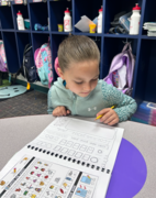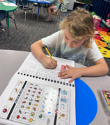 Our students are using the heart words they have learned and also stretching out words they do not know how to spell and then writing the sounds they hear. Even though the words might not be spelled correctly they are practicing hearing sounds, stretching words, and writing. Even though this can sometimes be difficult for students who may not like making mistakes or not having someone tell them how to spell a word it is helping them develop an understanding of how to sound out words that are unfamiliar to them and hear a sound and write it down. After the students write their sentence, they become illustrators. Students learn how to draw and color a picture to represent what their sentence is about.