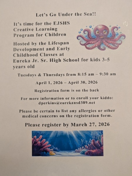 Eureka Junior Senior High School (EJSHS) is opening its doors to the community’s youngest learners this spring. The Lifespan Development and Early Childhood classes at EJSHS are hosting a Creative Learning Program, providing local children with an engaging educational experience while giving high school students hands-on teaching opportunities.